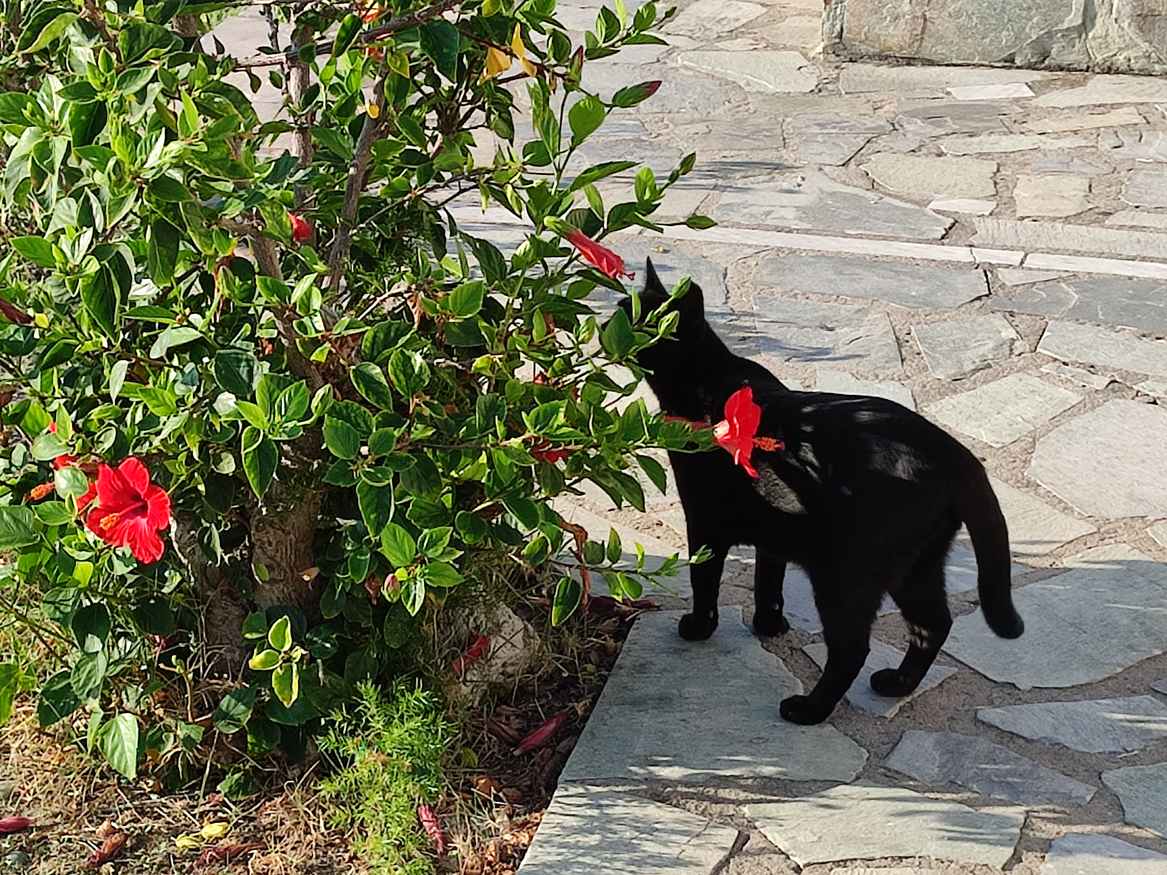 Fast als würde sie mir ein schönes Foto von sich gönnen, roch sie kurz sehr fotogen am Hibiskus, sodass der Kontrast des seidig schwarzen Felles mit dem Knallrot der Hibiskusblüten und dem Grün der Blätter auch wirklich zur Geltung kommt.